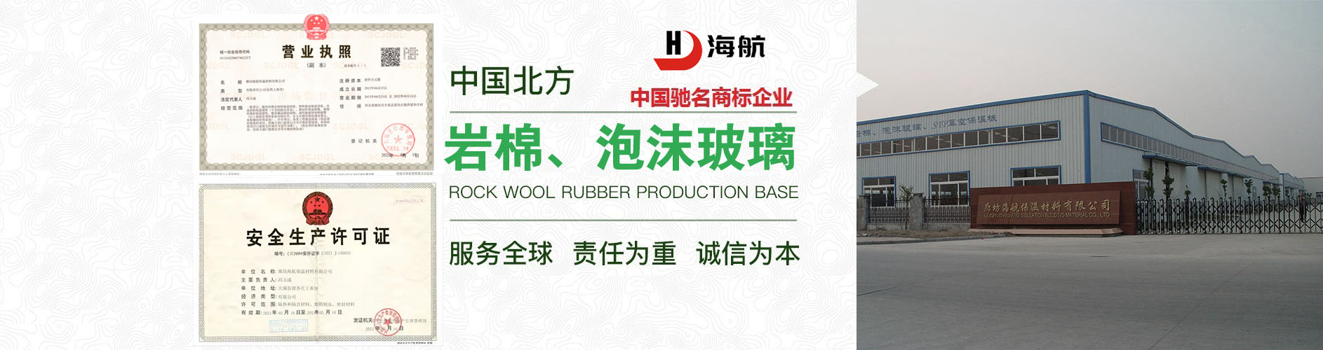 廊坊市海航保溫材料有限公司 地處河北廊坊留各莊高新技術產業園區,是集研發、生產和銷售于一體的大型企業,擁有11年保溫建材行業生產經驗,公司產品齊全,其中泡沫玻璃制品包括: 泡沫玻璃保溫板 、 泡沫玻璃保溫管 、 泡沫玻璃保溫磚 ; 巖棉制品包括 : 巖棉板 、 復合巖棉板 、 外墻巖棉板 、 巖棉氈 、 巖棉條 、 巖棉管 等保溫材料。 產品廣泛應用于地鐵、樓房屋頂、外墻防火隔離帶、石化、發電、航天、 鋼鐵、煉油、乙烯等行業的保冷、防腐、工程中。采用世界先進的設備,成熟的工藝生產,智能化操控,廢棄物循環利用,產品質量超過美國ASTM標準, 公司年產量50萬立方米的泡沫玻璃,80萬立方米橡塑海綿,5萬噸巖棉制品,4萬噸玻璃棉制品,16萬立方米擠塑板